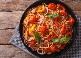 Spaghetti met gehaktballetjes, tomaat en basilicum